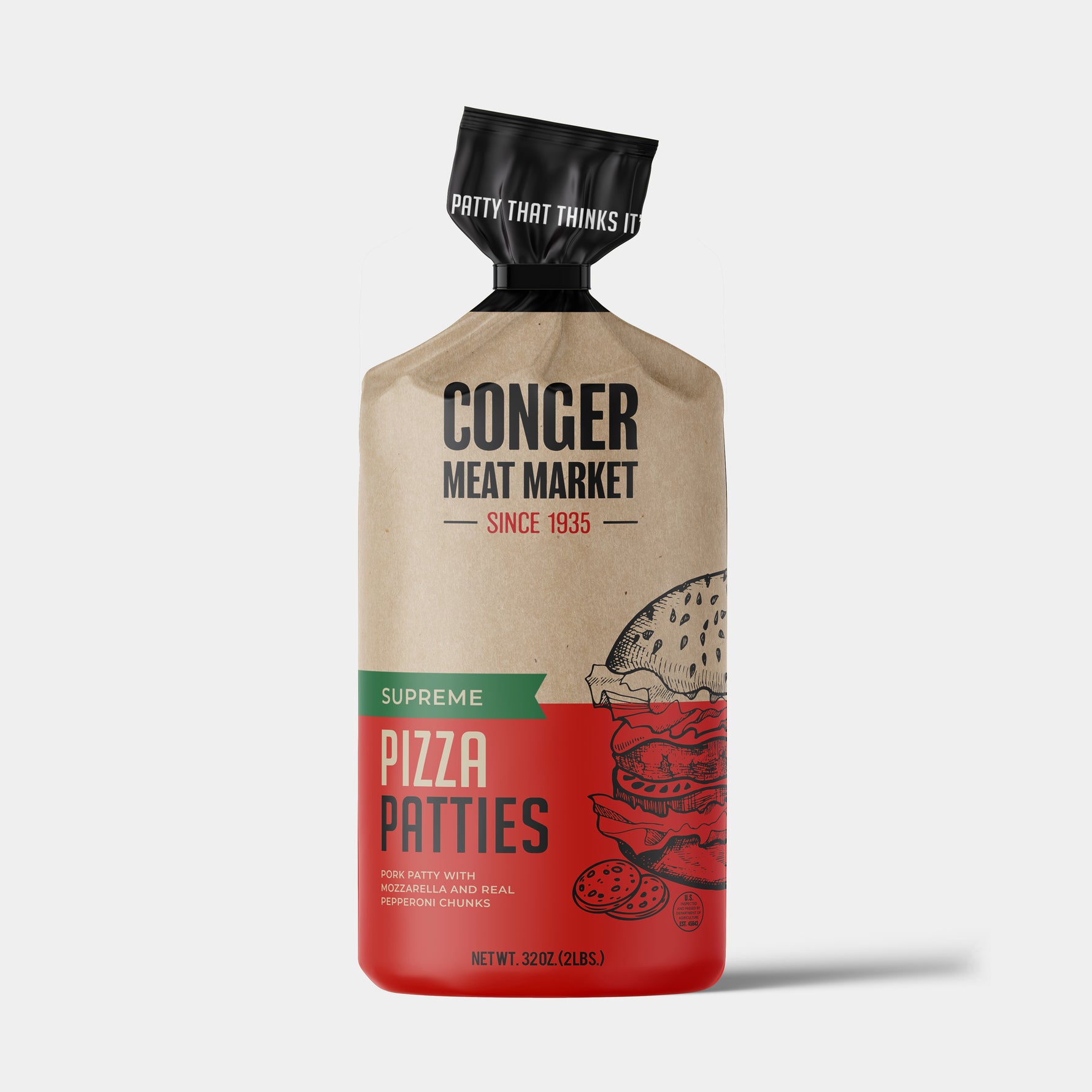 A loaded flavor experience—each frozen pork patty is packed with mozzarella, uncured pepperoni, mushrooms, onions, and peppers for that full supreme pizza taste.